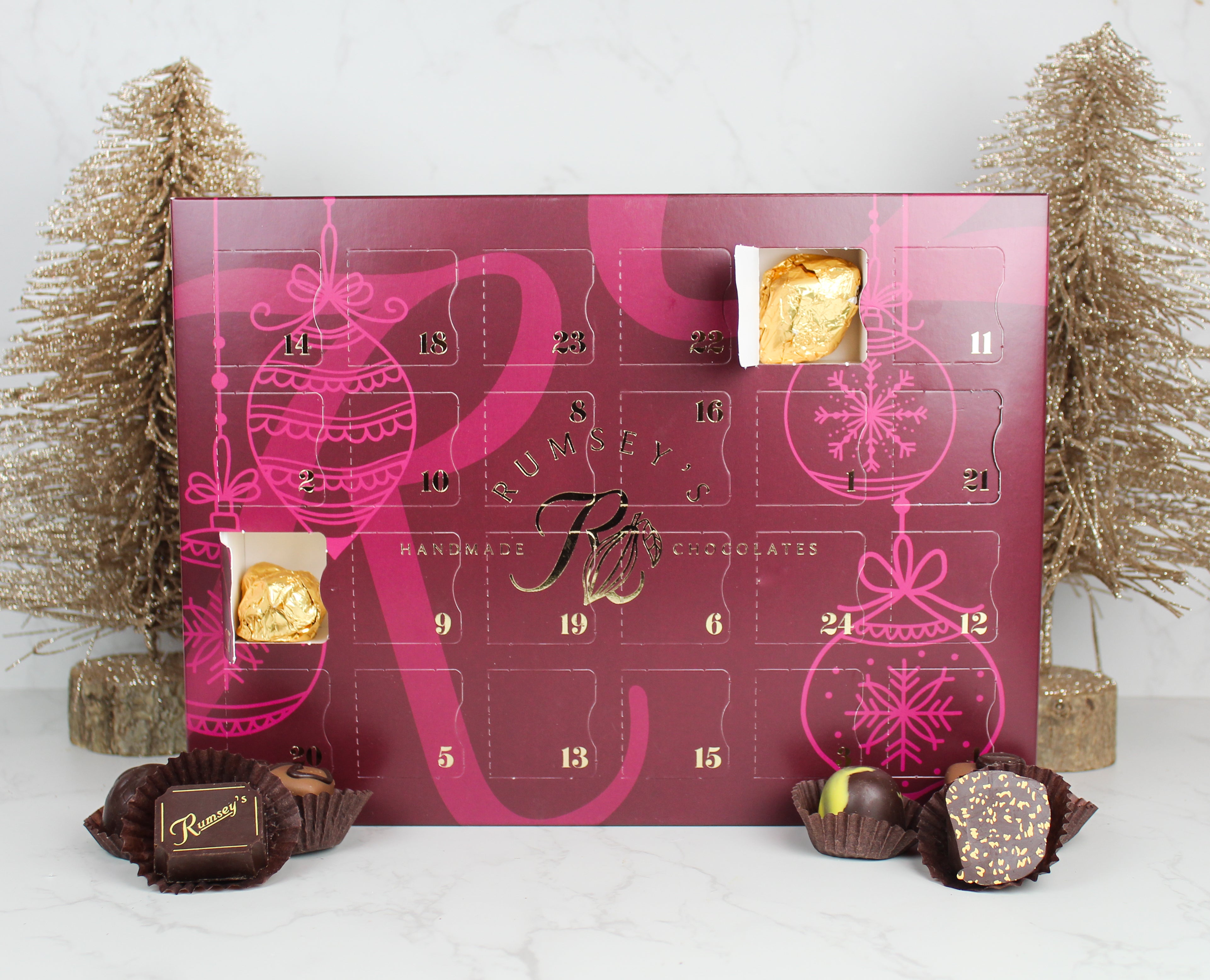 Rumsey's luxury chocolate advent calendars contains 24 of our best-selling, hand-made chocolates from our famous chocolate cabinet. A decadent mix of award-winning best sellers and seasonal classics, you'll enjoy a wonderful range of tastes and flavours throughout December.