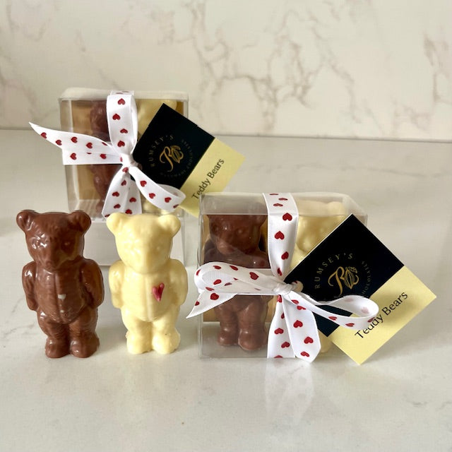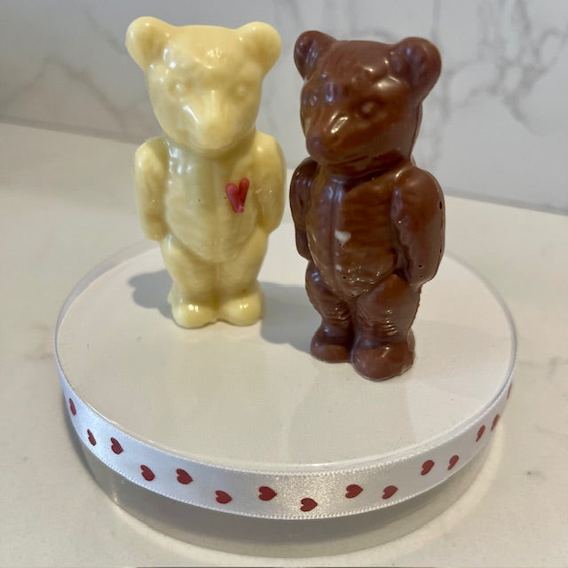 Deliciously cute milk and white chocolate teddy bears, handmade and wrapped for Valentine's Day with a pretty heart ribbon.